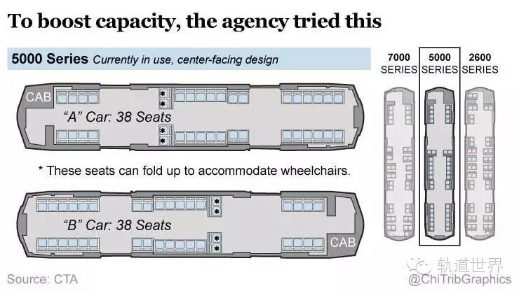 The new cars, with LED lighting and 37 to 38 seats each, will be a hybrid of the 5000 Series and the 3200 Series currently seen on the Brown and Orange Lines. The front of the cars will have aisle-facing seats to maximize standing space and make it easier for passengers to get on and off, while the rest of the car will have a mix of forward and rear-facing seat pairs and the popular single seats.