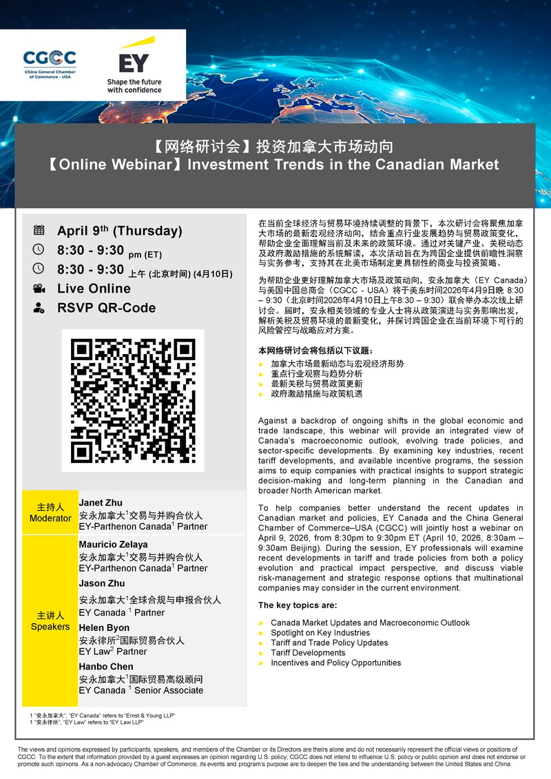 【网络研讨会】投资加拿大市场动向 CLICK HERE to RSVP When 2026年04月09日 8:30pm - 9:30pm ET Add to iCalendar Add to Google calendar Add to Outlook Where Online Share this event