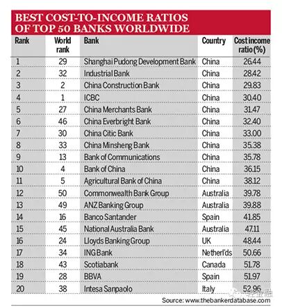 2、Top 1000 World Banks – Chinese efficiency heads cost-to-income ratio ranking