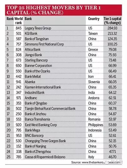 Along with LegacyTexas, the US’s BNC Bancorp – the 21st highest mover – is the other new entrant to the Top 1000 World Bank list. Five of the highest movers also re-entered the Top 1000 list this year. Among them are Greece’s Attica Bank, which made the biggest splash by recording a 79.08% increase on its Tier 1 capital in the 2015 ranking, followed by Iran’s Bank Mellat, which grew by 66.41%, and Slovenia’s Abanka, which achieved 66.05% growth.