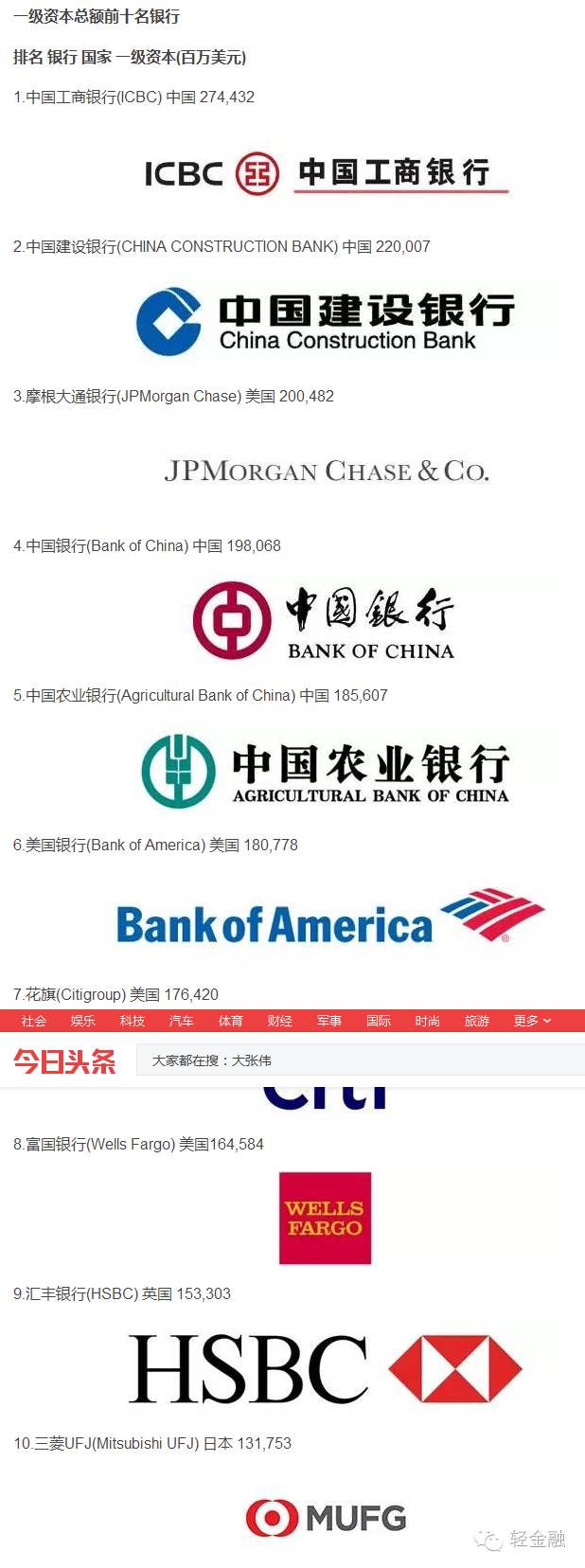 英国《银行家》月刊6月30日发布了全球1000家大银行榜单,按照一级资本总额排名。今年入围全球一级资本排名前十的银行名单与上年度相比没有变化,仍然是中国和美国各四家银行,英国和日本各一家银行。前十家几乎全被中国和美国银行占据。
