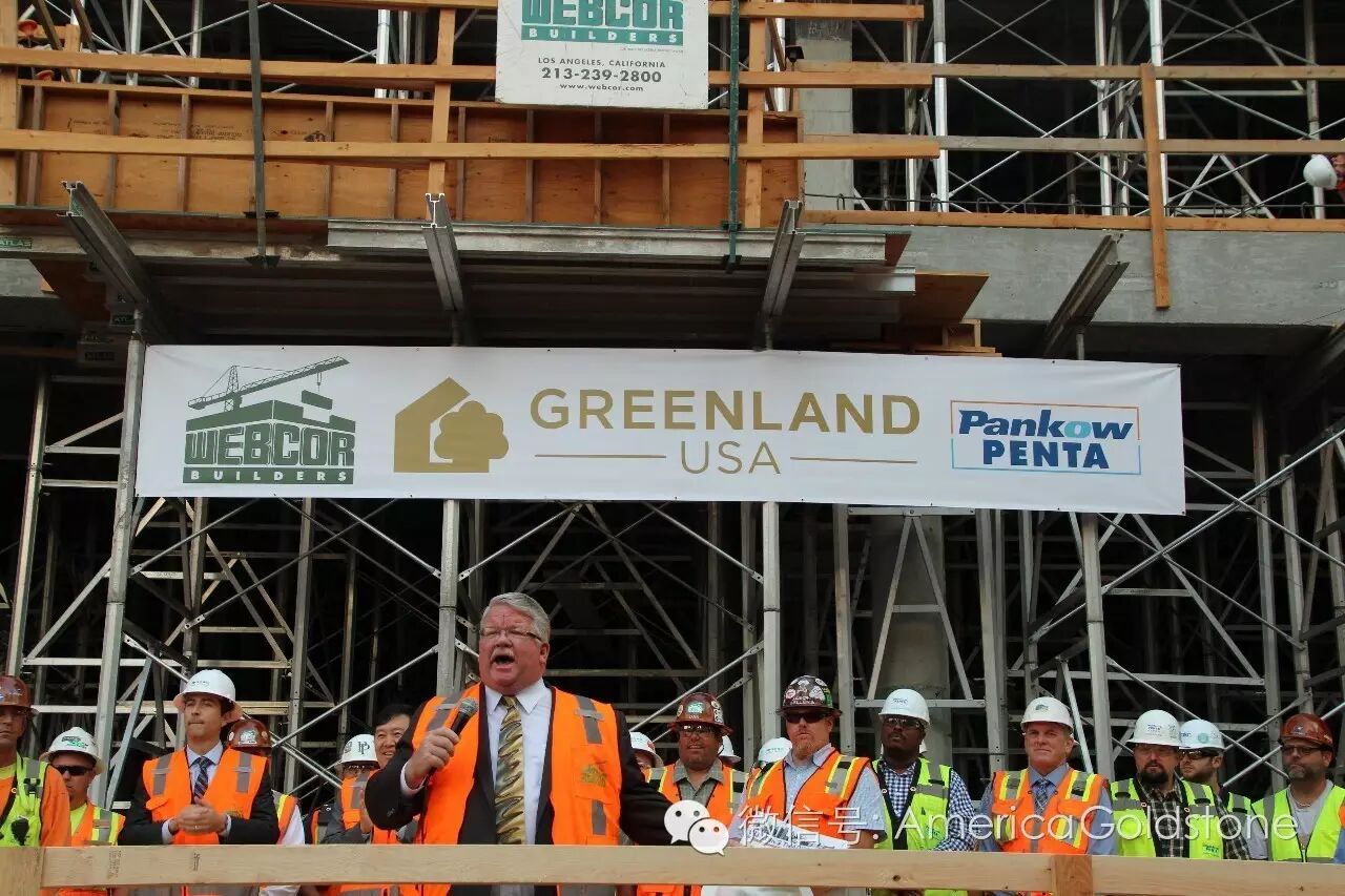 作为目前美国西海岸最大的在建住宅项目,同时也是洛杉矶市最大、雇工人数最多的工地,绿地中心项目雇佣的全部为当地建筑工人工会的成员。因此,在南加州颇具影响力、领导着整个洛杉矶及橙县建筑工人的工会主席Ron Miller也亲自到访并发言,慰问现场工人,称赞绿地在就业岗位创造方面为当地作出的巨大贡献,解决了大量工人的就业问题。