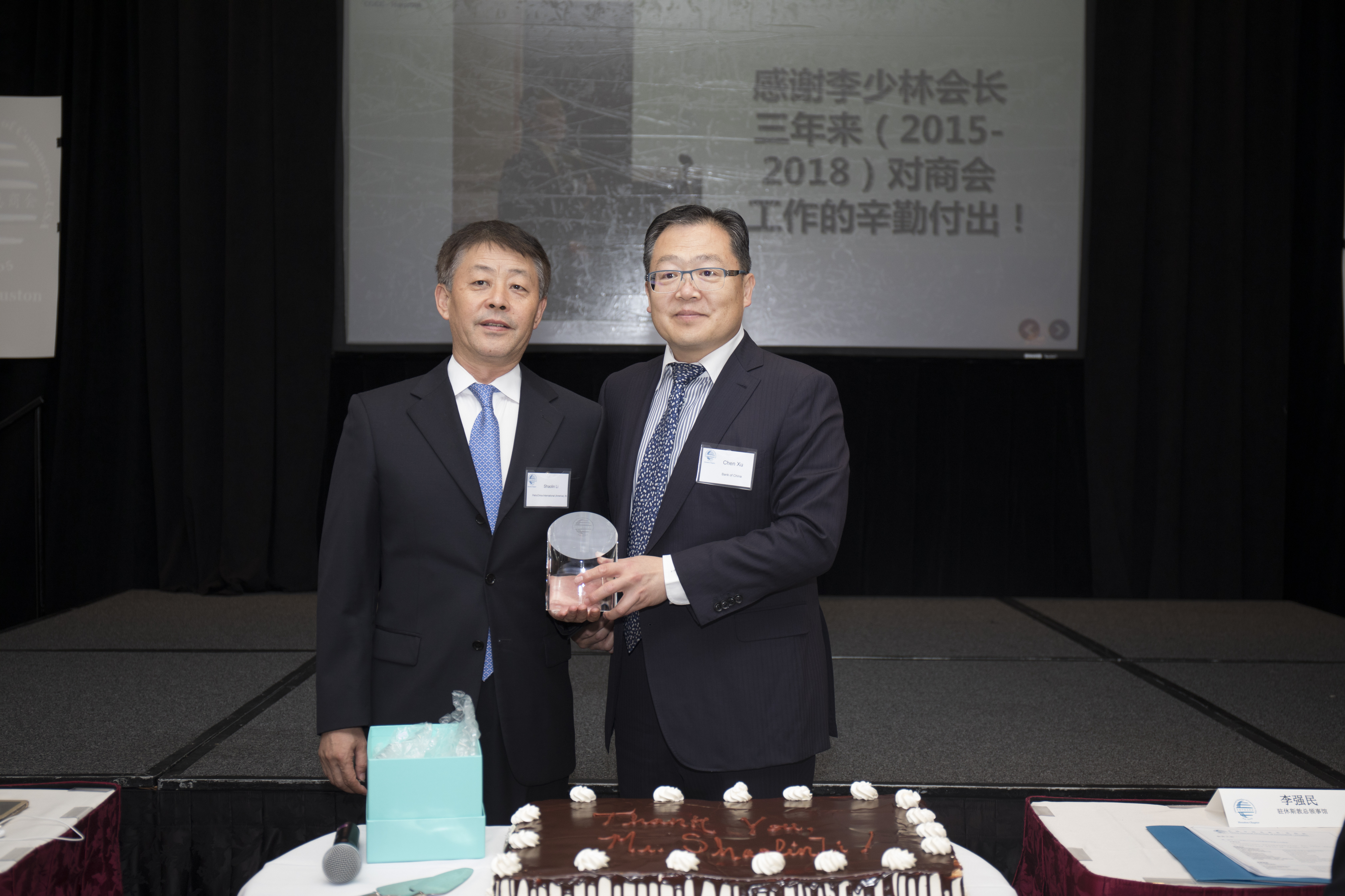本次理事及常务理事大会上,总商会休斯敦推选出代理会长。李少林会长因工作调动,无法担任会长一职。根据《美国中国总商会-休斯敦修订和重述之章程》,常务理事及代表一致推选中国石化美国公司&中国石化美国代表处总经理及总代表崔光磊先生担任代理会长一职。总商会徐辰会长特别为李少林会长颁发纪念奖杯及蛋糕,诚挚感谢李少林会长自2015至2018三年来为商会工作的辛勤付出及奉献。